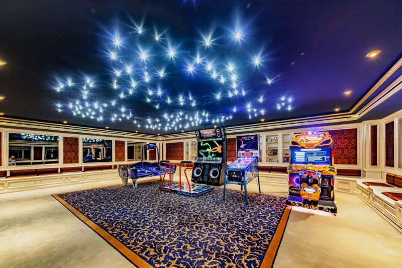 Но есть там одна комната, которая тронула меня просто до слез! Миллиардер! И он делает игровую комнату с аэрохоккеем, стрелялкой и одноруким бандитом. Серьезно! Это реально - очень и очень трогательно! Я бы вот прям купил. Только эту комнату. Можете завернуть и прислать, а?