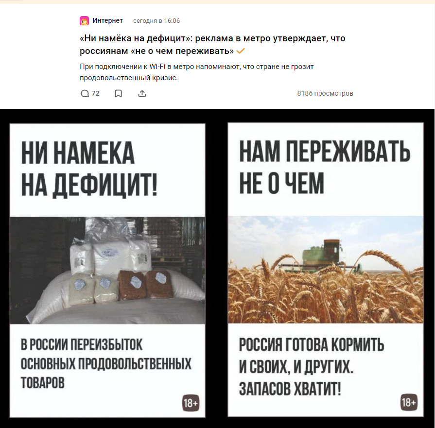 Жители Москвы и Петербурга обратили внимание в соцсетях на новую рекламу в метро при подключении к Wi-Fi. Теперь там появляются плакаты об отсутствии проблем в России — в них утверждается, что дефицита не будет, «запасов хватит», а на замену заблокированным соцсетям придут новые, «российские».