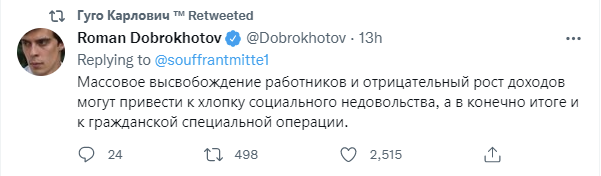 Она также сказала, что "в простой выведено почти 95 тысяч работников, что в 2,5 раза выше, чем на 1 марта, но на порядок меньше, чем в пик пандемии". "Сейчас рост в данном направлении прекратился", - отметила Мухтиярова. (Отсюда.)