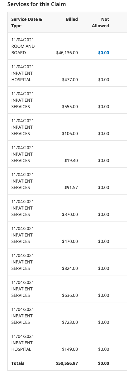(кстати удивляюсь с "подкиньте денежек на лечение в штатах, 10-30 тыщ долларов всего надо на операцию" просьб, и думаю где они такие цены нашли дешевые, в примере - счёт за неделю в больнице - и это без врачей - только собственно медсёстры и койка. Каждый врач отдельно выставляет счёт, даже если он просто мимо проходил и заглянул спросить как дела (т.н. drive by doctoring) - да, страховка его немного уменьшит, но не очень сильно, будет не 50, а скажем 45 из которых они потом оплатят процентов 80-90)