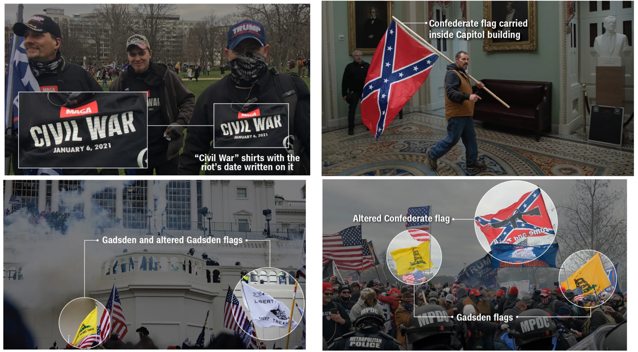 The Gadsden flag has also been used by groups and individuals on the right. The Gadsden flag was featured prominently in a report related to the January 6, 2021, attack of the United States Capitol.[47][b]