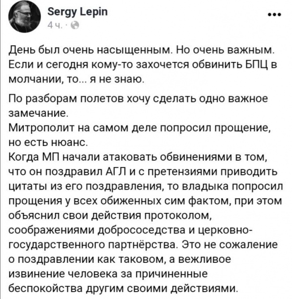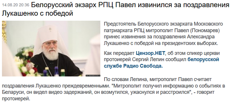 Нелегка жизнь верховных попов при шатающемся автократическом режиме. Сначала минский митрополит Павел (он посланник Московского патриарха в Беларуси, как я понимаю) сердечно поздравил Лукашенко с победой на выборах. (Текст уже много где выпилили, но Интернет все помнит.)