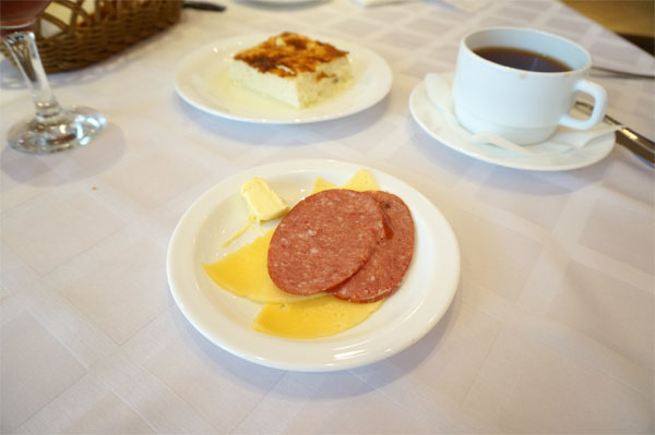 Никаких шведских столов там не было обнаружено - ну, оно и ладно. Каждому пришедшему давали тарелку с кашей, хлеб, два прозрачных кусочка колбасы и сыра плюс омлет-запеканку из моего пионерского детства. Правда, это почему-то не пришлось ждать целый час - не знаю, что с ними произошло.
