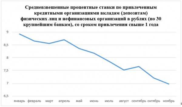 Тех, кто успел открыть вклад в начале 2016 г., пожалуй, можно поздравить с неплохой инвестицией. В сентябре Банк России снизил ключевую ставку до 10%, и средняя ставка по вкладам (по 30 крупнейшим банкам) со сроком привлечения свыше 1 года, согласно данным Банка России, упала с 8,93 в январе до 6,97% в ноябре.