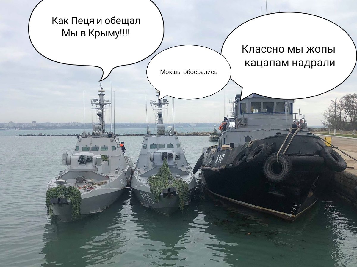 Как интересно со вчера развивались события. Сначала объявили о том, что три украинских корабля нагло нарушили границу РФ, вовсю там хозяйничали, грабили корованы, а на корректное предложение российских пограничников покинуть территорию вели себя вызывающе и даже протаранили буксир, у которого было повреждено ведро и в двигателе сломался важный болт, повлекший шок у судового механика. Шизофреник Горный на "Эхе" тут же развизжался о "Провокации Порошенко" (я душевнобольных не читаю, но мне "Эхо Москвы" его статью подло подсунуло).
