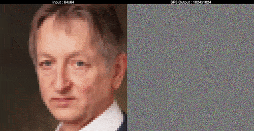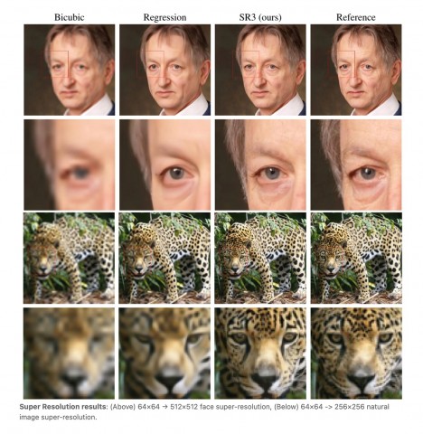 Команда Brain Team продемонстрировала два алгоритма генерации фотографий. Используя технологию SR3, предусматривающую апскейлинг с помощью повторного уточнения, нейросеть увеличивает разрешение картинки, достраивая недостающие части из гауссовского шума. Обучение этой модели построено на методах искажения изображения и последующем обратном процессе.