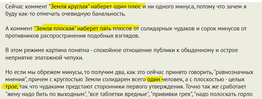 А коммент "Земля плоская" наберет пять плюсов от солидарных чудаков и сорок минусов от противников распространения подобных взглядов.