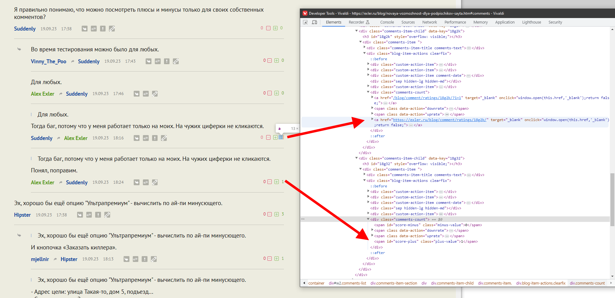 Чтобы посмотреть, кто именно ставил плюсы и минусы, нужно щелкнуть по числу минусов или плюсов (без разницы).