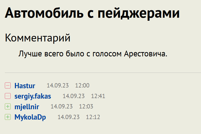 - Вообще избавиться от этой страницы, на ней же ничего, кроме этого списка нет. Пусть список показывается в tooltip-е при hover/click. Причем пусть будет два списка -- над красными те, кто поставил минус, над зелёными -- плюс.