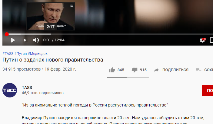 В официальном канале "ТАСС" на Youtube выложили сенсационный ролик с интервью Путина о задачах нового правительства.