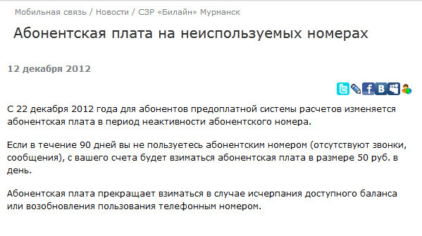 Beeline сделал пользователям новогодний подарок. Это пока вроде только в Мурманске, но такую смелую инициативу, как я думаю, они скоро распространят на все регионы. $50 в месяц за неиспользуемую симку - да они просто милые, милые! У меня где-то валялась билайновская симка для тестирования телефонов - надо сходить в офис и аннулировать ее к чертям. Потому что в Beeline реально ох-фигели.