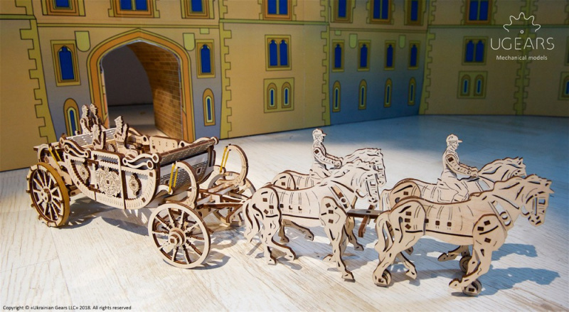 Так еще и самое интересное заключается в том, что карета самостоятельно движется! Колёса приводит в действие скрытый резиномотор: его работу видно через специальные отверстия в корпусе экипажа – это просто какое-то чудо!