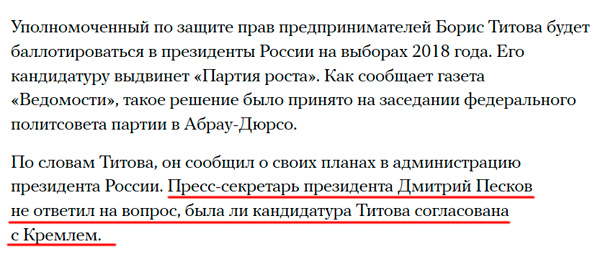Для цирка-шапито "выборы президента" подобрали еще одного спойлера под названием Бизнесмен. Кандидатура его не была согласована с Кремлем, поржал Песков перед журналистами. Он, знаете ли, сам вызвался. Он просто из такой партии и у него что-то там выросло.