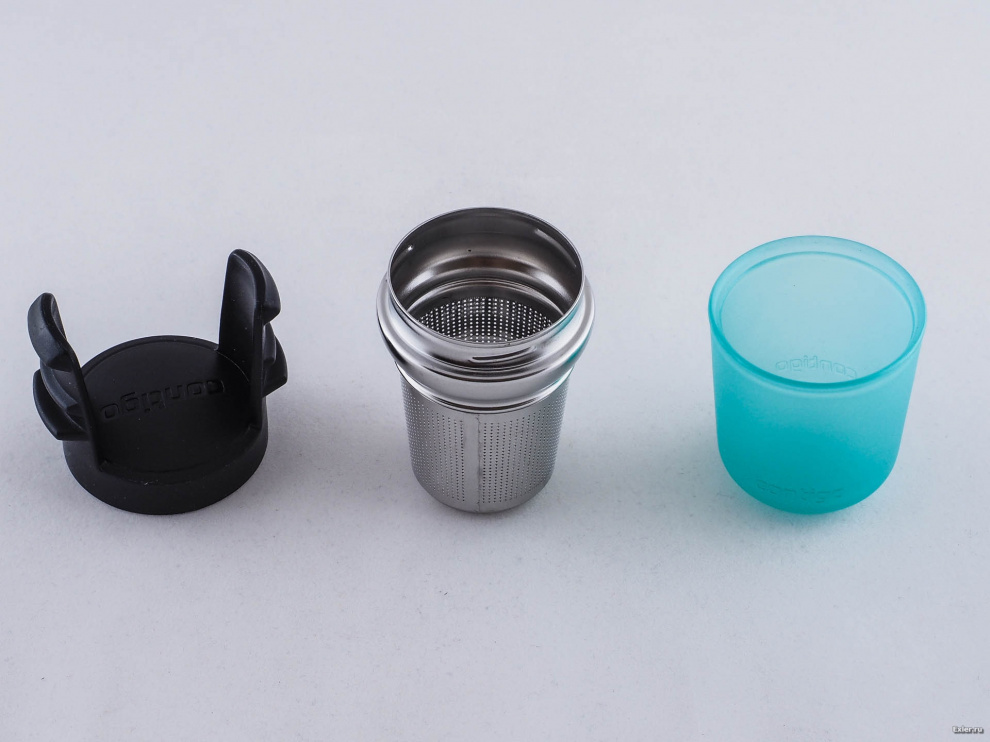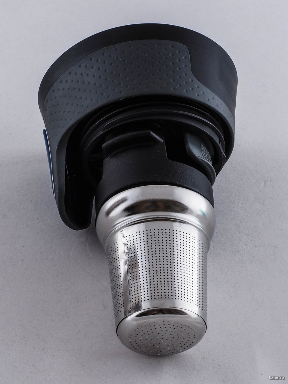 Конструкция очень простая: емкость с ситечком, навинчивающаяся крышка с креплением под крышку термокружки, подставка.