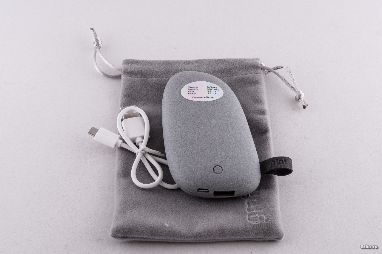 Следующая батарея еще более интересная - Gmini mPower MPB562. Тут емкость поменьше - 5600 мАч. Но батарея реально легкая (132 г), небольшая, а главное - очень оригинально выглядит: как морская галька. Батарея покрыта очень приятным на ощупь шероховатым пластиковым покрытием, имеет порт microUSB для зарядки, выход USB на 1А для подключения устройств. При нажатии кнопки на корпусе специальными светодиодами показывает уровень зарядки своей батареи. Плюс в комплект входит удобный чехол. Очень симпатичная батарея, у меня она теперь в сумке лежит для обычных локальных разъездов.