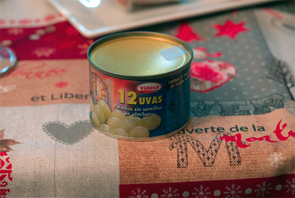 Это старая испанская традиция: пока бьют часы с каждым ударом надо съедать по одной виноградинке и загадывать желание - тогда оно исполнится. Наборы из 12 очищенных виноградин без косточек перед новым годом продаются во всех магазинах.