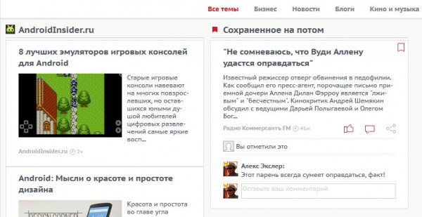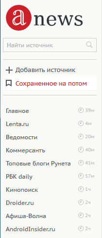 Слева сверху идет рубрикатор, по которому вы можете отбирать издания, также есть ссылка "Сохраненное на потом", чтобы сразу переходить к ленте закладок для прочтения.