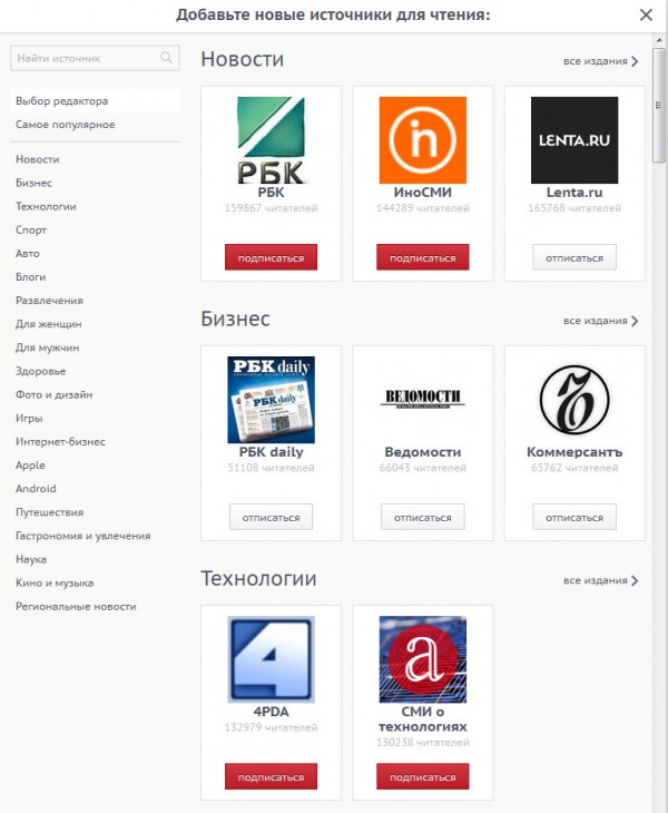 Набор изданий разбит по категориям и это все можно редактировать под себя (подключать, отключать) в разделе "Добавить источник".