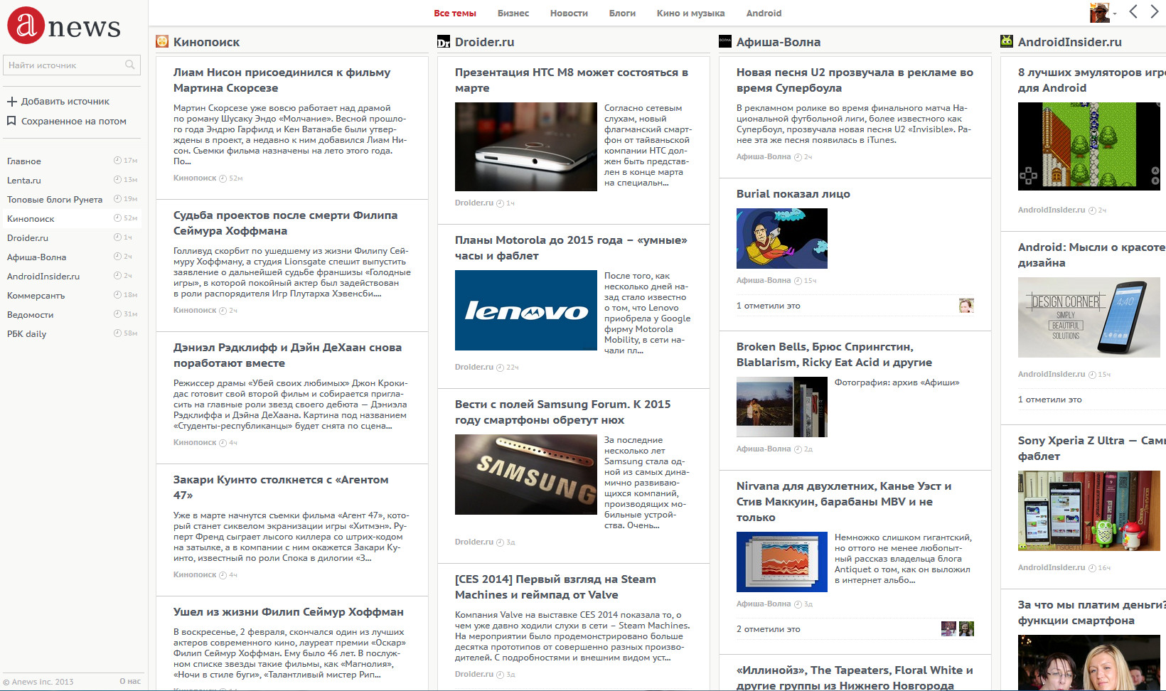 Друзья сделали новый новостной агрегатор - Anews.com. Пригласили потестировать. Я сначала почему-то подумал, что это агрегатор RSS-потоков и пытался туда добавить свои подписки, но потом оказалось, что там совсем другая идея. Вы там не можете добавлять свои RSS-подписки - агрегатор не для этого. (Да и свои подписки удобнее всего держать в Feedly.)