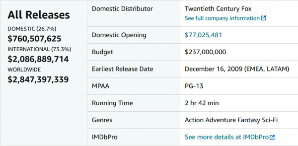Старый "Аватар" по миру собрал почти три миллиарда.