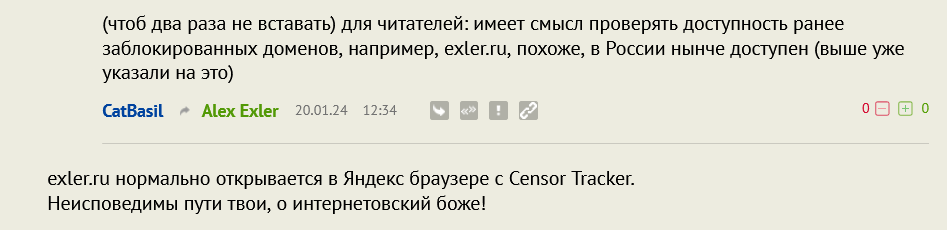 (чтоб два раза не вставать) для читателей: имеет смысл проверять доступность ранее заблокированных доменов, например, exler.ru, похоже, в России нынче доступен