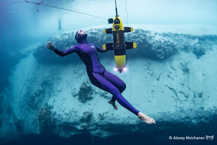 Upd: Задал Алексею вопросы из комментариев. По поводу открытия глаз, цитирую: "Глаза совершенно спокойно можно открывать. Давление действует только на лёгкие и пазухи с воздухом. Глазам совершенно давление не мешает." Ну и по поводу того, чем снято все погружение - это такой специальный подводный дрон, который затачивали под эти съемки. Управляется дистанционно по проводу. Вот как он выглядит - Алексей прислал фотографию.