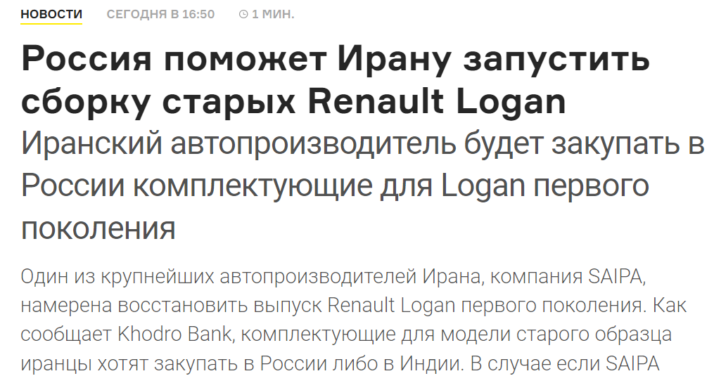 Один из крупнейших автопроизводителей Ирана, компания SAIPA, намерена восстановить выпуск Renault Logan первого поколения. Как сообщает Khodro Bank, комплектующие для модели старого образца иранцы хотят закупать в России либо в Индии. В случае если SAIPA достигнет договоренностей с российской стороной, иранская версия Logan под названием Renault Tondar может получить «вазовские» двигатели объемом 1,6 и 1,8 литра.
