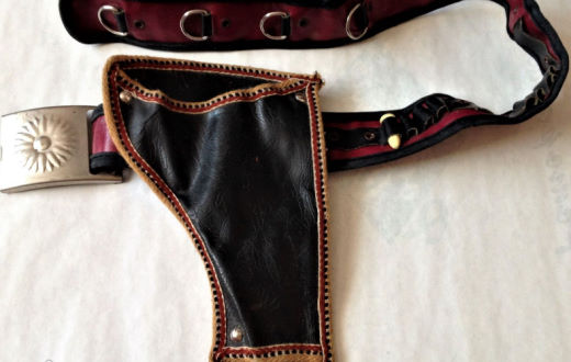 Он стрелял очередями со звуком и вспышками - в корпусе трещал электромоторчик, в стволе мигала лампочка. Батарейки вставлялись в рукоятку. У меня в подарочном комплекте был ещё и ремень с кобурой и патронташем для декоративных патрончиков: