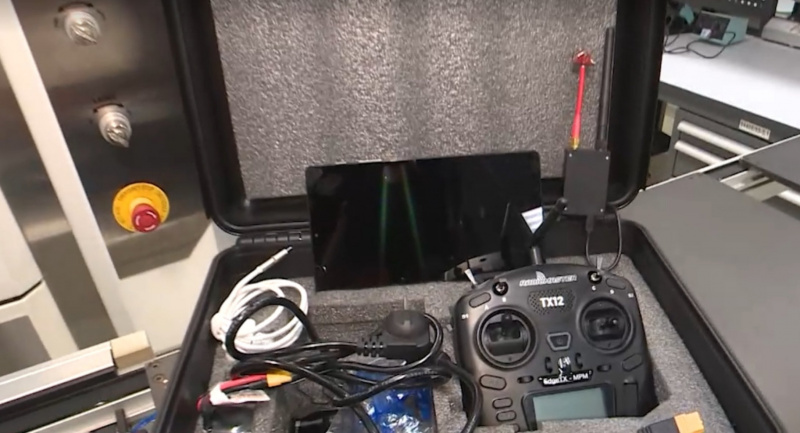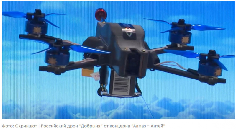 «Весит дрон „Добрыня“ меньше килограмма, без батареи так вообще легкий, поставляется он вот в таком прочном водонепроницаемом кейсе, в комплекте идет сам беспилотник, пульт, планшет, соединительные провода, несколько съемных аккумуляторных батарей, причем заряжать беспилотник можно не только от обычной розетки, но и от автомобильного аккумулятора, что полезно в полевых условиях», — подчеркнул Облендер. (Отсюда.)