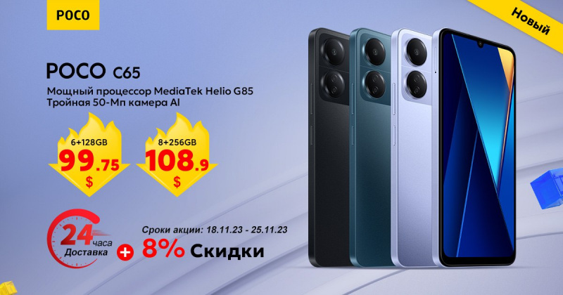 С сегодняшнего дня на "Озоне" доступна для покупки со скидкой новая модель смартфона POCO C65 (Global version).