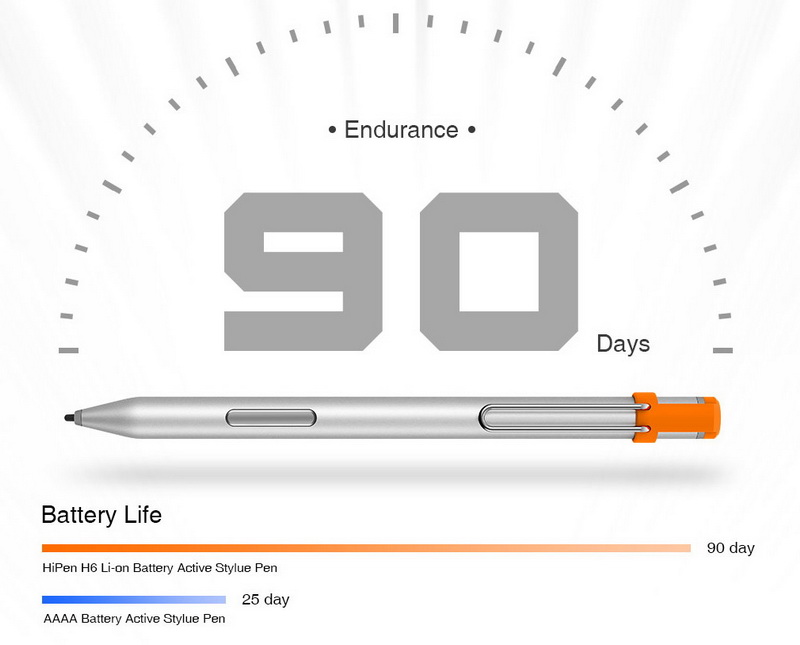 HiPen H6 оснащен литий-ионным аккумулятором высокой плотности. Интеллектуальное управление питанием обеспечивает до 90 дней непрерывного пользования и до 180 дней в режиме ожидания. В отличие от обычных стилусов с элементами питания типа AAAA HiPen H6 заряжается через порт Micro USB. Это удобнее и выгоднее, чем менять севшие батарейки.