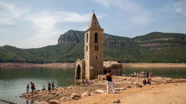 В Испании набирает обороты новый вид туризма, связанный с небывалой жарой. Из-за нее в различных регионах страны высыхают водоемы, и из-под воды появились всякие строения, которые раньше были полностью или частично скрыты под водой. Появились целые деревушки, мосты, церкви и другие сооружения.