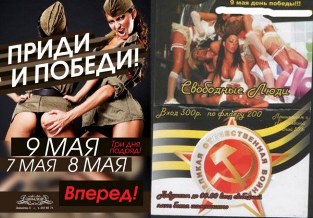 В детсадах, школах поощряется массовое переодевание в военную форму, ежегодные грандиозные парады, по моему оценочному суждению, давно уже не воспринимаются как событие, мероприятия по разнарядке - все это низвело когда-то действительно праздник до будничного явления. Плюс почти никак не регулируется использование символики.