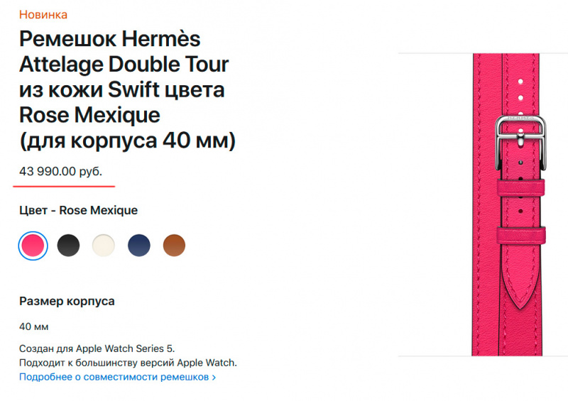 А вот еще один потрясающий аксессуар, который ни один грузчик у вас не уведет. Вы же купили Apple Watch за 39990 рублей, правильно? Ну вот теперь самое время прикупить для них стильный ремешок Hermès Attelage Double Tour за 43990 рублей. Там, кстати, даже есть разные цвета - на любой вкус.