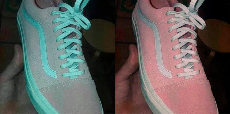 Таким образом, совершенно достоверно можно сказать, что на рисунке слева серо-зеленый кроссовок (он же на оригинальном изображении), а справа розово-белый, с коррекцией цветов. Глаз можно обмануть, анализатор цветов - нет. Если кто-то видит на оригинальном рисунке розово-белый, то у вас своеобразное восприятие цветов.