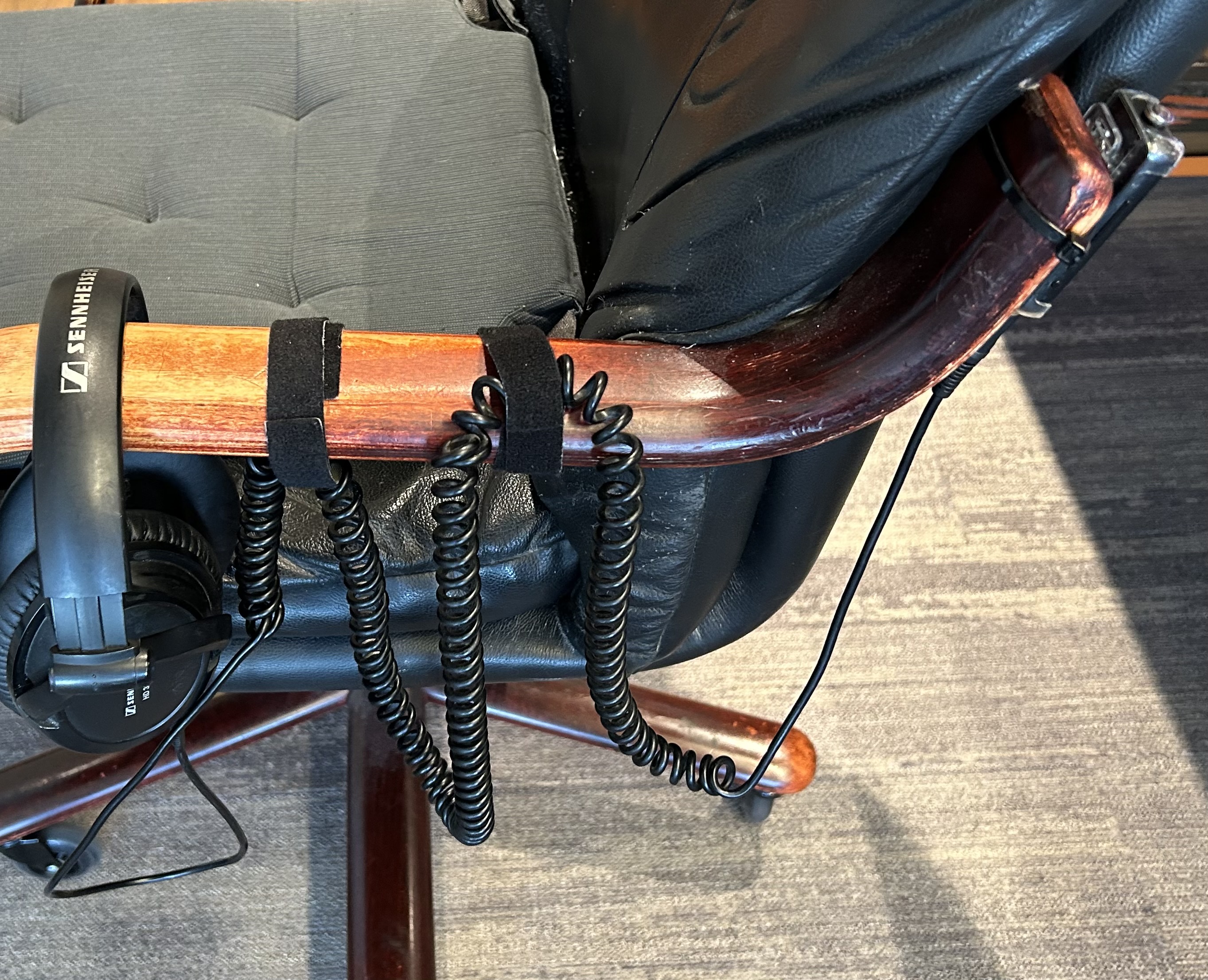 Кресло обычное. Просто я люблю упомянутые наушники (не спрашивайте, сколько им лет и сколько раз я менял амбушюры), но в какой-то момент кабель начал жутко раздражать. Купил простой усилитель для Bluetooth-соединения с 3.5 мм аудиовыходом, прихватил кабель липучками к левому подлокотнику, а для усилителя сделал петельку при помощи стяжек (на усилителях обычно есть зажим). Потом понял, что не все усилители могут раскачать относительно низкоомные наушники, купил другой подороже, а там уже Алекс прорекламировал FiiO 3 - обзавёлся им. Но недостаток его - хватало примерно на полдня. Купил FiiO 5 - восемь часов пашет идеально с великолепным качеством. Я бы сфотографировал, но сейчас я работаю из дома, где можно включать музыку через акустическую систему, никому не мешает (кроме собак).