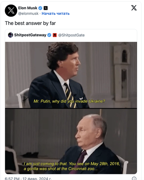 Маск сказал, что на Путина оказывается давление, чтобы он довел войну до конца. "Если бы он отступил, на него было бы совершено покушение", - сказал Маск. (Прим. Экслера - оцените уровень "аналитики" Маска.)