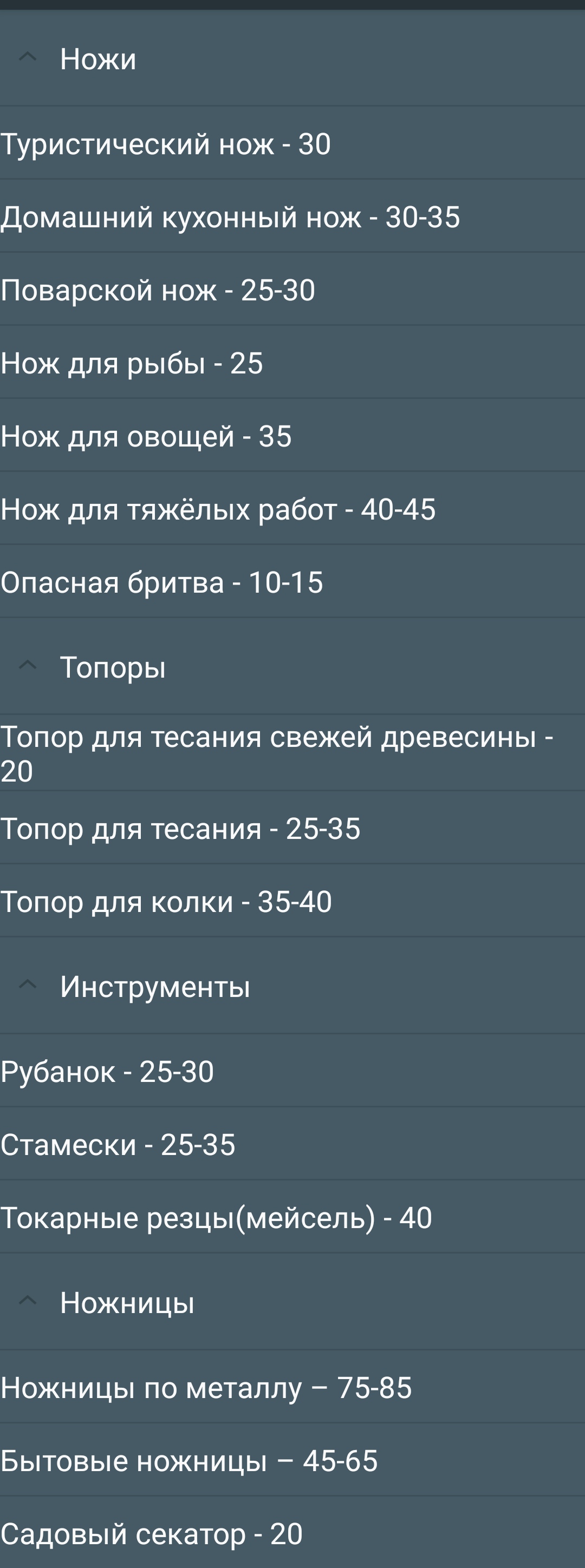 Я затачиваю 25-30 обычно. Чем тверже сталь, тем угол больше, хозяйственники и охотничьи 40-45.