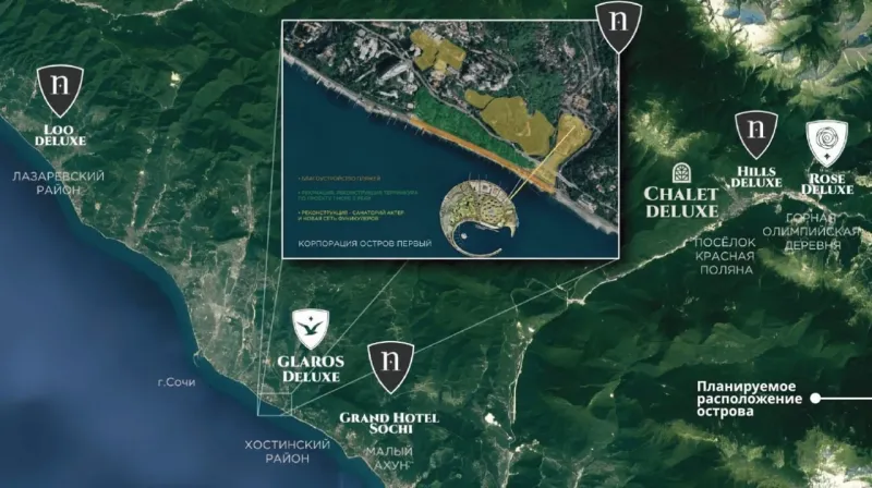 Искусственный остров площадью 50 га планируется построить напротив Мацестинского виадука. На территории хотят возвести 1,5 млн кв. м недвижимости - гостиницы, апартаменты, малоэтажное жилье. Планируется строительство марины для яхт и башни для айтишников. По словам Шакирова, будет создано 10 тыс. рабочих мест.