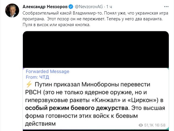 Сейчас идет очередная эскалация. 19 вот "первые учения по проведению превентивного стратегического ракетного удара", потом 24 еще высказывание в адрес других стран, на тему не забывать о ядерном чемоданчике и не вмешиваться. Потом Финам намекнули на #можемповторить, они несколько запоздало, на мой взгляд, поворачиваются в сторону НАТО.