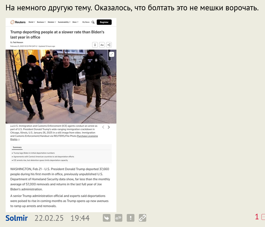 Самое паршивое даже не в том, что Трамп публично лжет и выкручивает руки не агрессору, а жертве агрессии - а в том, что с т.з. его избирателей это абсолютно нормальное и даже правильное поведение. Т.е. правление Трампа это не какой-то случайный глюк системы, а естественный и закономерный итог её развития. "Лги, воруй (что-то там ещё про гусей)" - моральные ценности, от которых не воротят нос большинство американских избирателей и которые их ставленник успешно продвигает уже в мировом масштабе.