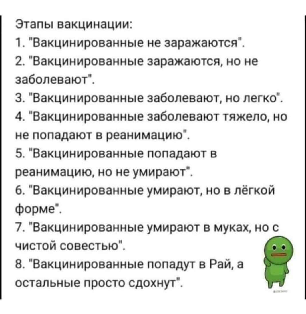 Невероятно раздражает, когда начинаются рассуждения в духе "а говорили, что 70% вакцинированных будет достаточно, а теперь говорят, что нужно 80%, а чего они завтра скажут???". Вот не обнаглели ли вы вконец? Вам говорят - вот вам отличная эффективная вакцина совершенно бесплатно, это резко повышает ваши шансы выжить. Когда вы будете вакцинированы - станете намного менее опасны для общества, и вернете себе право свободного посещения мест, где скапливается большое количество народа. Нет, вы будете выделываться до тех пор, пока не сдохнете, заразив остальных. Это даже не "назло матери уши отморожу", это намного хуже.
