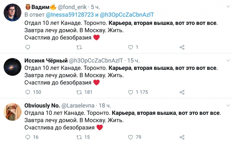Вообще подобные сделанные под копирку посты из твиттера постят совершенно регулярно, на совершенно разные темы. Скрепные, либеральные, ольгинские, рекламные, коронавирусные, дочьофицерские...