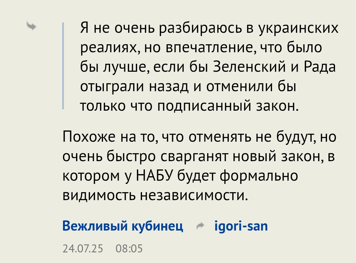 Вот взять хотя бы его реакцию на конфликт НАБУ и друзей Зеленского