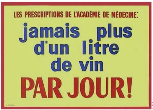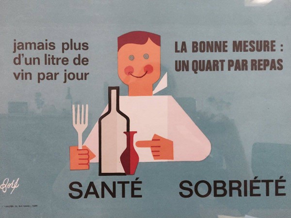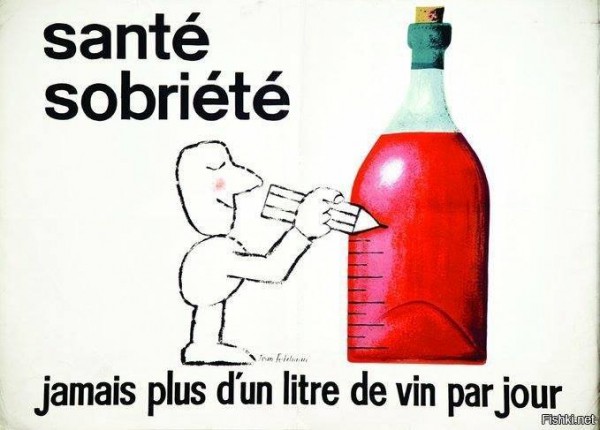 У Юрия увидел забавные французские плакаты времен пятидесятых прошлого века. Борьба за трезвость в полном разгаре. На плакатах написано: "Рекомендации Медицинской Академии: пейте умеренно – не больше 1 литра вина в день".