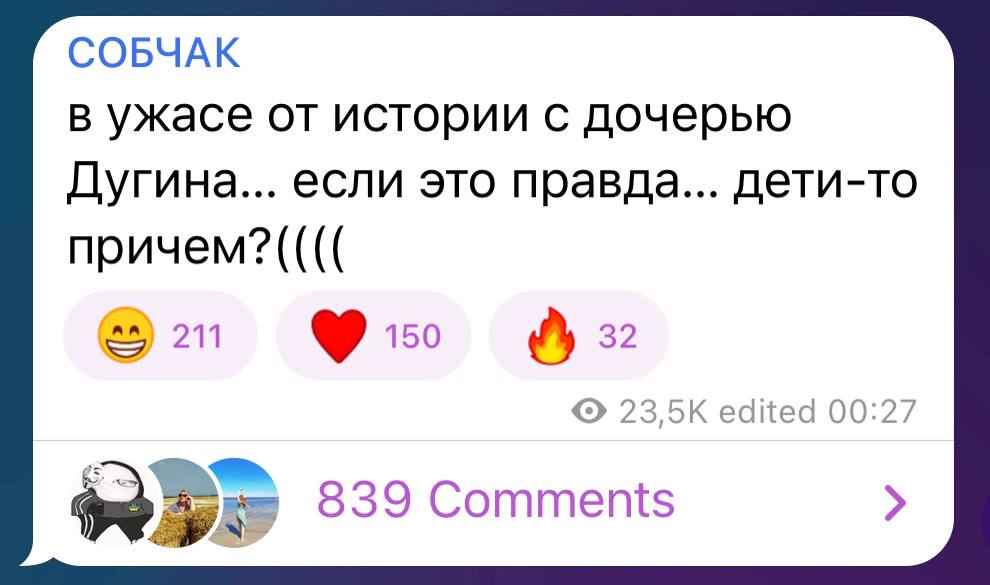 Дочь Александра Дугина убил, разумеется, Владимир Путин: тот, кто развязал эту преступную войну, убил десятки тысяч ни в чем не повинных людей, а теперь, устами своих бесконечных симоньяних будет картинно заламывать руки и наиграно удивляться: как же так могло случиться, что война пришла и в Подмосковье.