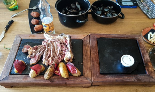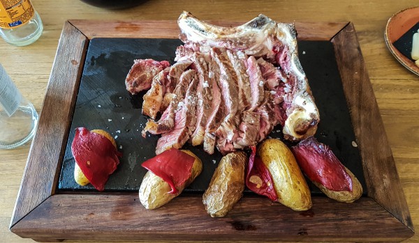 И вот тут первый раз увидел суперграмотную подачу чулетона. Дело в том, что чулетон на кости невозможно равномерно прожарить. С края он может пережариться, а у кости останется практически сырым. Поэтому здесь они делают слабую прожарку, подают чулетон на теплой поверхности, а тебе дают еще отдельную хорошо нагретую планчу, на которой можешь дожаривать кусочки так, как тебе нравится. Вот это - очень и очень удобно.