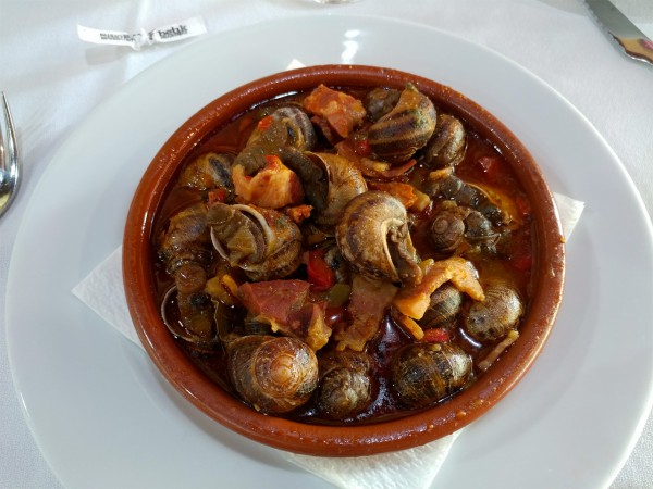 На закуску взял свои любимые улитки ("каракольес"). Интересно то, что в каждом ресторанчике их и делают по-разному, и улитки используются различных сортов. Здесь улитки были довольно большие и приготовили их в мясном соусе - получилось очень и очень вкусно.