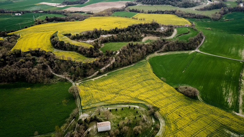 Съездили в интересный городок - сто сорок километров от нас на север (там много всего, будет два больших репортажа). По дороге проезжали колоритные поля с желтенькими цветочками. С дороги смотрелось весьма эффектно. Дай, подумал я, коптер запущу, с высоты это красоту сниму - будет хороший кадр.