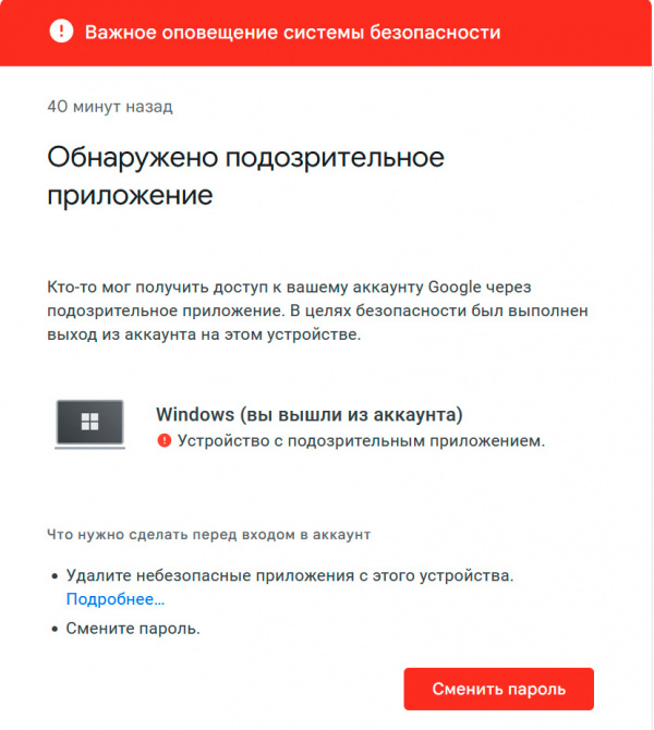 Обычно такие проблемы не уникальны и в инете вероятно уже не раз перетирали и эту тему. Стоит загуглить "обнаружено подозрительное приложение" и посмотреть на результаты в разделе картинок (скриншот такого-же предупреждения). Возможно, что-нибудь толковое кто-то уже и нарыл. Тут одно из двух: или паранойя гугл-аккаунта (реакция на вашу-же показавшуюся необычной активность), или реально вредоносное ПО на устройстве. Последнее можно попробовать купировать отключением подозрительных браузерных плагинов, сканированием одним-двумя антивирусами, но обычно требует переустановки виндов.